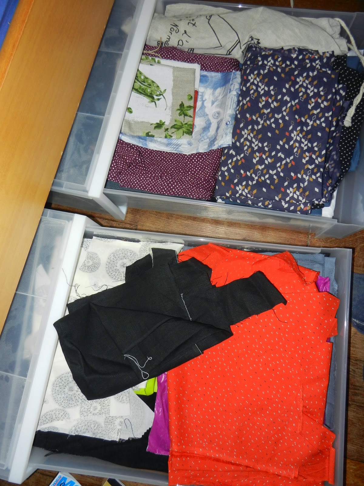 Et ici mon stock de tissus, 2 tiroirs cachés sous le lit: un de coupons ou grosses chutes (en haut) et un de petites chutes que je garde au cas où...